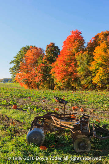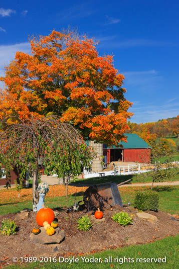 Charm, Holmes Co. Ohio Cornshock and pumpkins in flower garden along curve in road