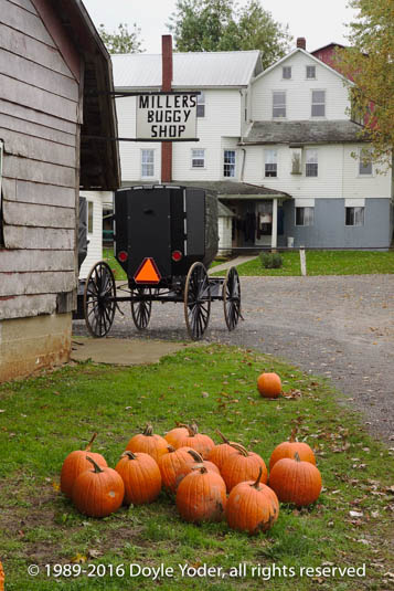 Walnut Creek, Holmes Co. Ohio Cornshock and pumpkins with farm building red barn behind buggy going by on road