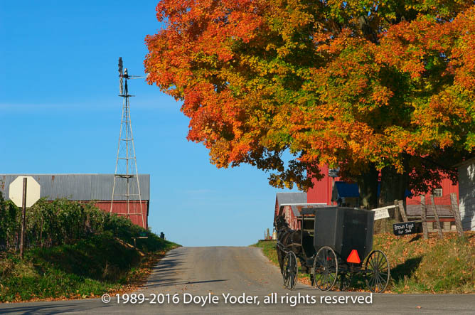Farmerstown, Holmes Co. Ohio Bright red tree along road with buggy coming down road