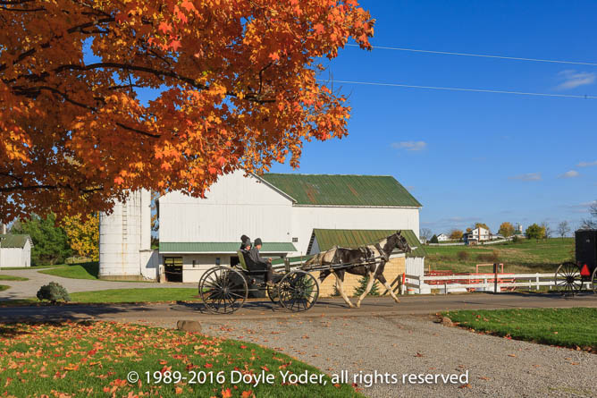 Becks Mills, Holmes Co. Ohio Buggy coming up road with bright colored trees and white barn behind