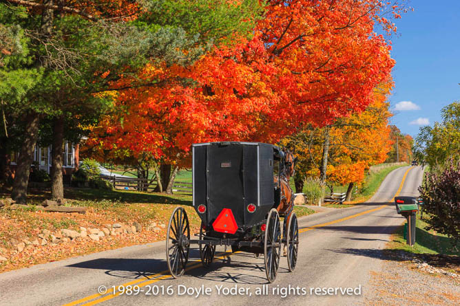 New Bedford, Holmes Co. Ohio Buggy coming up road through woods lined with bright yellow trees