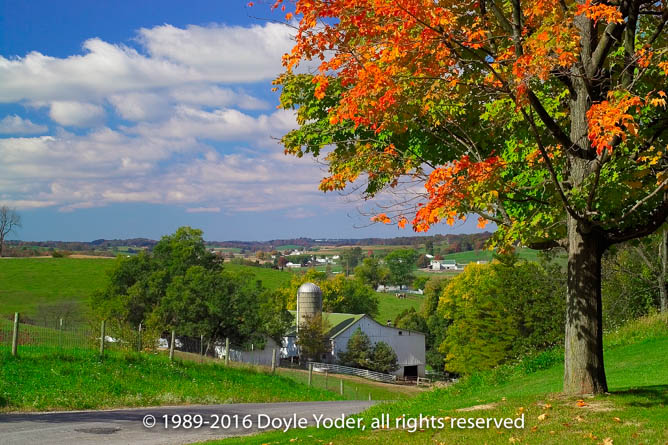 Farmerstown, Holmes Co. Ohio Bright red tree with farm red barn in valley behind Hack going by on road