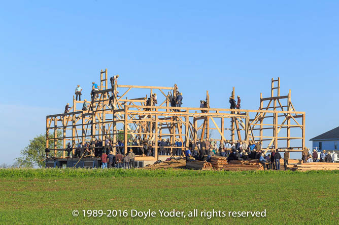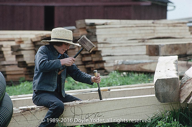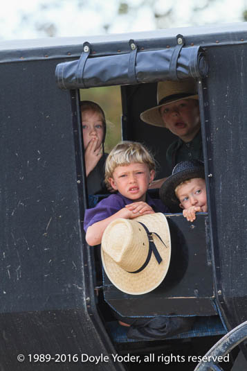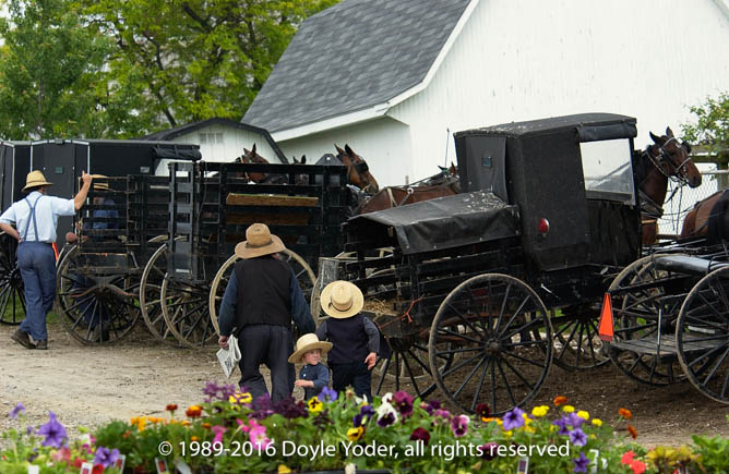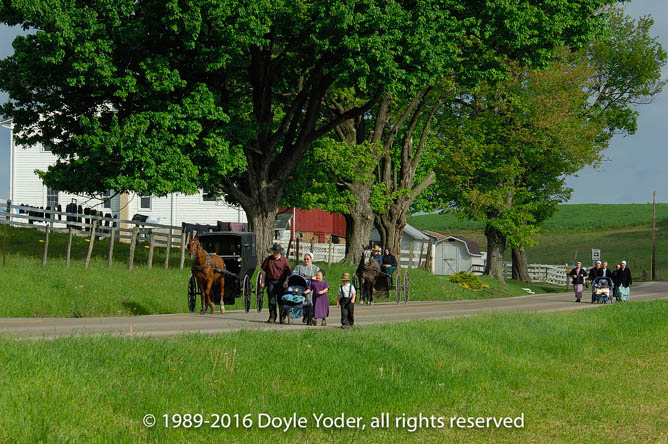 Shreve, Holmes Co. Ohio Buggy going away on road and people walking past flowers and lilac bush towards farm house to church
