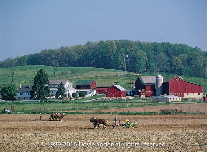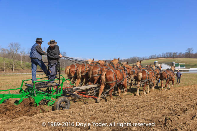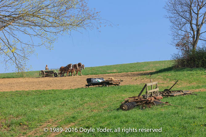 Mt Hope, Holmes Co. Ohio Team of five horses pulling spring harrow and team of two horses pulling corn planter in field behind wagon
