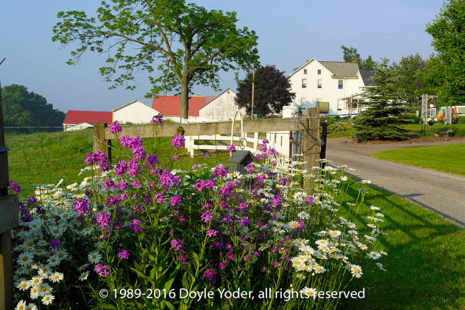 Charm, Holmes Co. Ohio Flower garden along road farm white barn behind Road cart going away on road