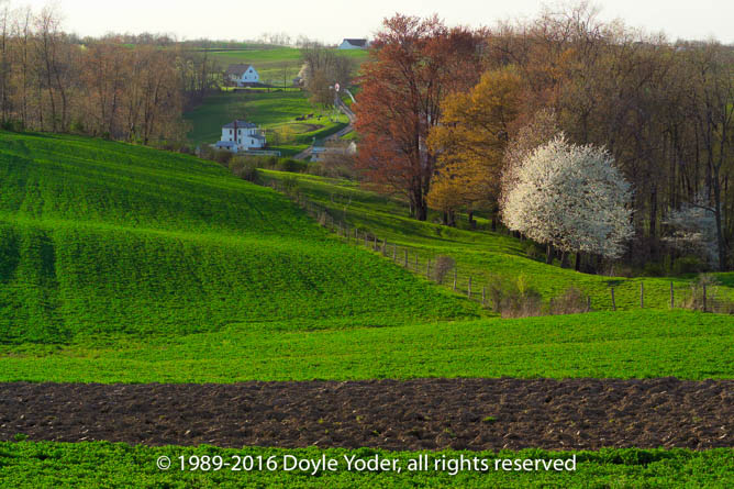 Bunkerhill, Holmes Co. Ohio Daffodils and Tulips in yard framed under tree Farm with white barn behind Small wagon coming up road