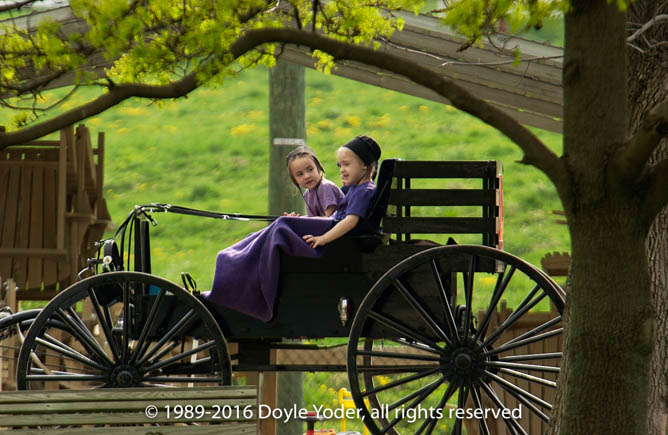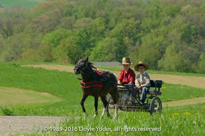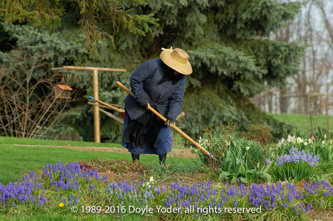 Millersburg, Holmes Co. Ohio Daffodils in flower garden with buggy going past on road