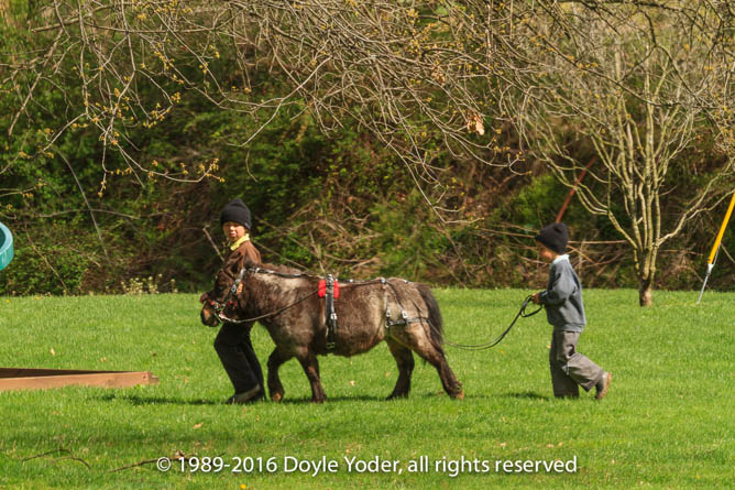 Boy on cart being pulled by pony with white barn behind framed under blooming tree