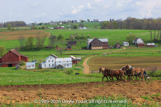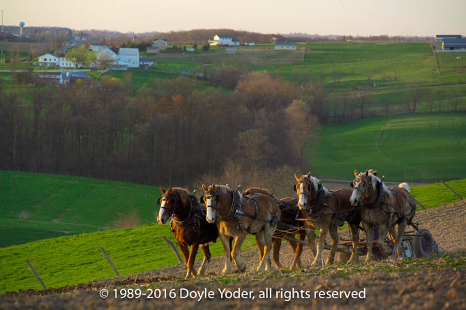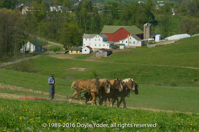 Walnut Creek, Holmes Co. Ohio Team of four Belgian and team of four Perchron horses pulling riding plow in fields with cows in field farm houses and white barn behind