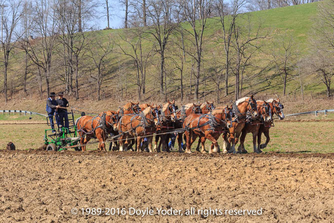 Mt Hope, Holmes Co. Ohio Team of six Belgian horses pulling riding plow in field