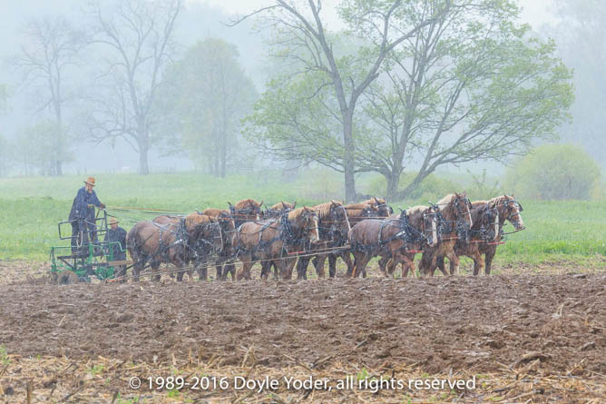 New Bedford, Holmes Co. Ohio Team of six horses pulling riding plow in field