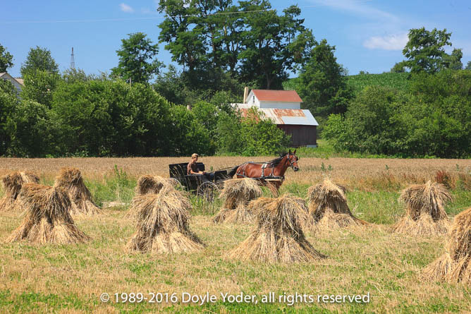 big white barn behind field full of wheat shocks, hack with milk cans on going away up lane