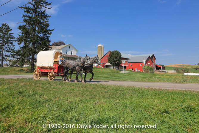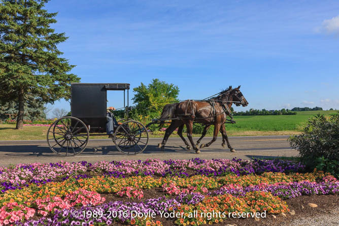 Mt Hope, Holmes Co. Ohio Buggy Flower garden with team of horses pulling wagon behind on road