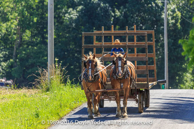 Becks Mills, Holmes Co. Ohio Haflinger horses pulling carriages coming down hill through field
