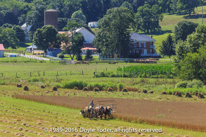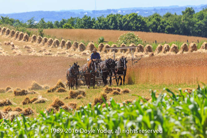 Mt Hope, Holmes Co. Ohio team of three belgian horses pulling grain binder in field