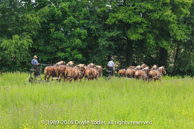 Farmerstown, Holmes Co. Ohio team of four belgian horses pulling grain drill with team of two belgian horses pulling hay rake